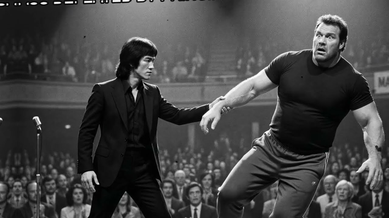 Menschen schauten hoch zu ihm, wie zu Monument, wie zu Berg, wie zu Unmöglichkeit. Er erreichte Bühne, kletterte hinauf, stand neben Bruce. Kontrast war, schockierend. Bruce 1,2, 64 kg. Der Mann 2 m, 140 kg. Mehr als doppeltes Gewicht, 30 cm größer. David und Goliat, aber rückwärts. Bruce lächelte. Herzlich willkommen.