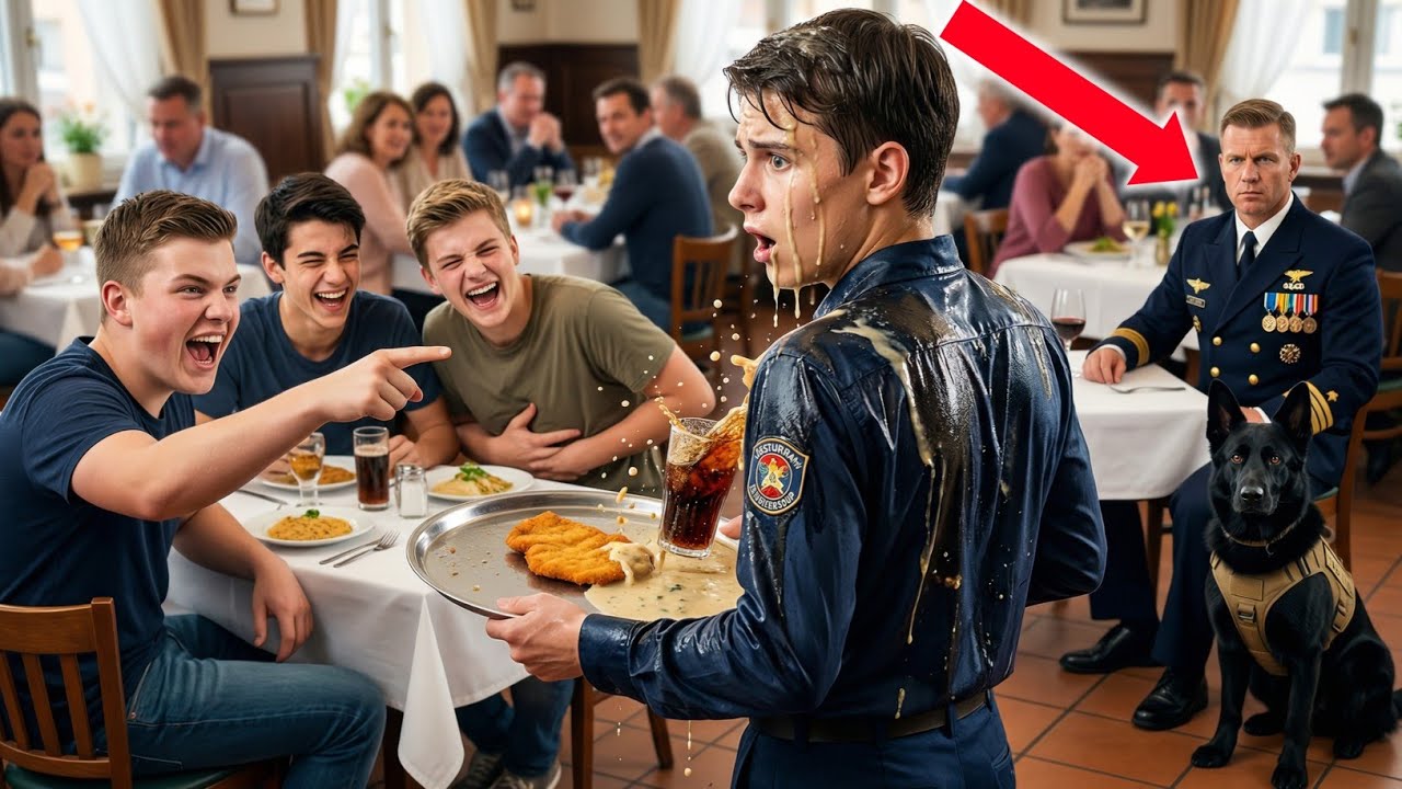 Schäferhund mit einer Arbeitshundweste auf [musik] dem Rücken. Kapitän Erik Hoffmann hatte ruhig in der Ecke gegessen, aber er hatte alles gesehen, jede einzelne Sekunde davon. Er kam herüber, nicht schnell, nicht langsam [musik] und kniete sich neben Emil. Ohne ein Wort half er, die letzten zerbrochenen Teller aufzusammeln. [musik] Dann stand er auf, schaute Finn, Marco und Tobias direkt an und sagte mit einer ruhigen, tiefen Stimme, die irgendwie den ganzen Raum füllte: “In meiner [musik] Welt lachen wir nicht über die